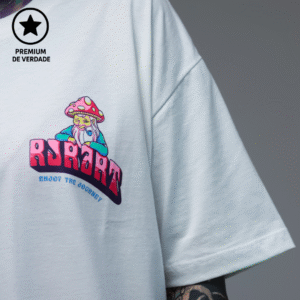Estampa feita em serigrafia silk-screen, técnica clássica que garante alta definição, cores vivas e acabamento resistente.
